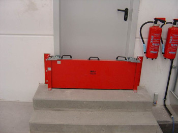 Der Einsatz dieses Barrieren-Typs wird bevorzugt bei überdimensionierten Größen oder geringen Raumhöhen. Im Ernstfall wird bei diesem System der Sicherungsbügel gelöst und der gesamte Barrierenkörper in die Schließposition gedreht und geklappt. Wie bei den anderen Systemen wird durch das Umlegen des Schnellspanners die Bodendichtung angepresst und der Barrierenkörper arretiert.